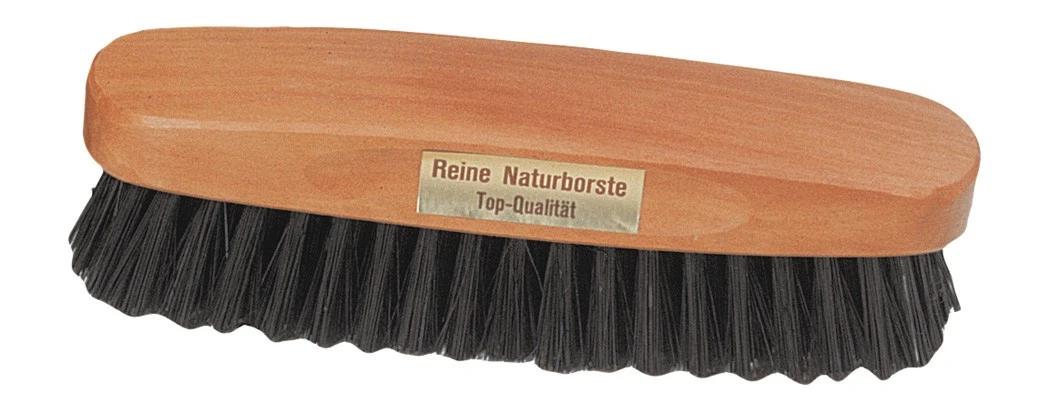 Wooden clothes brush with waxed pearwood & stiff black bristle.
