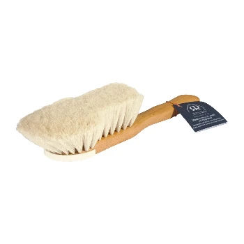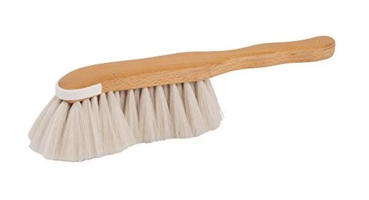 Wooden s-shaped dust brush with waxed beechwood handle & goat hair. The soft goat hair is excellent for dusting and soft on the touch.