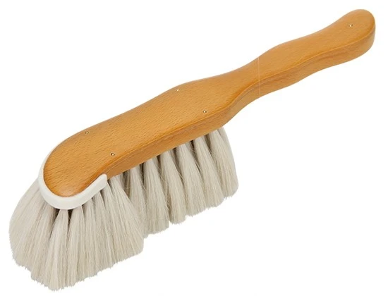 Wooden s-shaped dust brush with waxed beechwood handle & goat hair. The soft goat hair is excellent for dusting and soft on the touch.