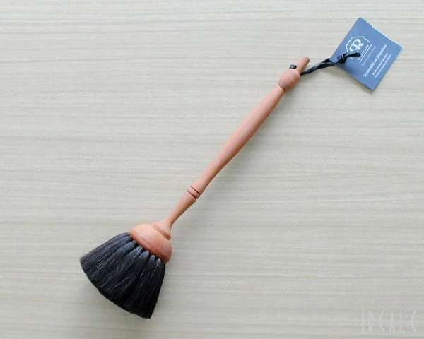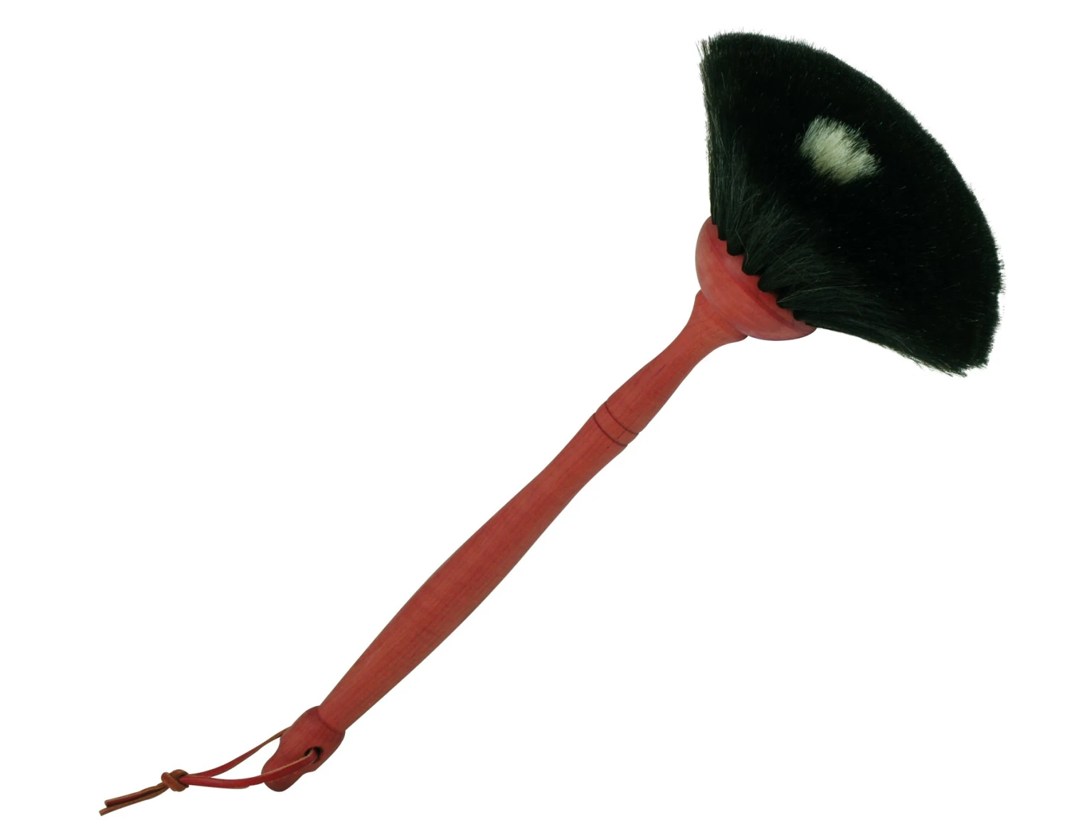 Wooden dust brush with oiled pear wood handle & black goat hair with white dot.
