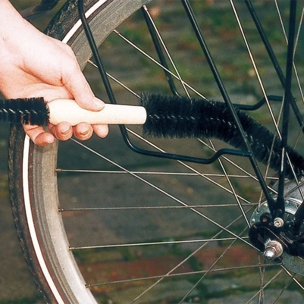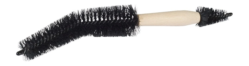 Wooden double ended bicycle, motorbike brush with an untreated beechwood handle & horsehair. Thanks to its curved shape you can easily reach and clean all dirty areas from guard plate to spokes to car rims. The small brush is especially suited for cleaning of gear rings.