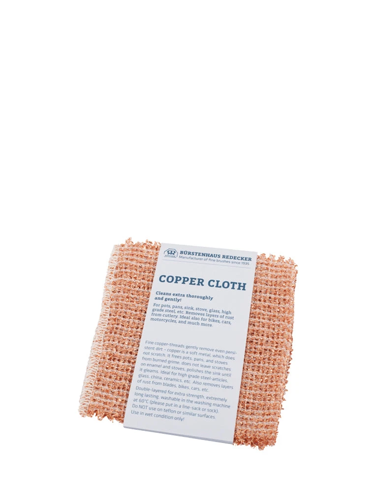 This Copper Cloth from Redecker makes sensitive objects shine. Ideal for cleaning pots, pans, sinks, ovens, ceramic cooktops, glass, stainless steel, etc. especially thoroughly and gently. Perfect for removing rust from cutlery. Fine copper threads loosen even the most stubborn dirt carefully – because copper is a soft metal that is non-abrasive. Woven copper fibre Double-layered for extra strength 14 x 15 cm Use in wet condition only Not suitable for Teflon or other non-stick surfaces