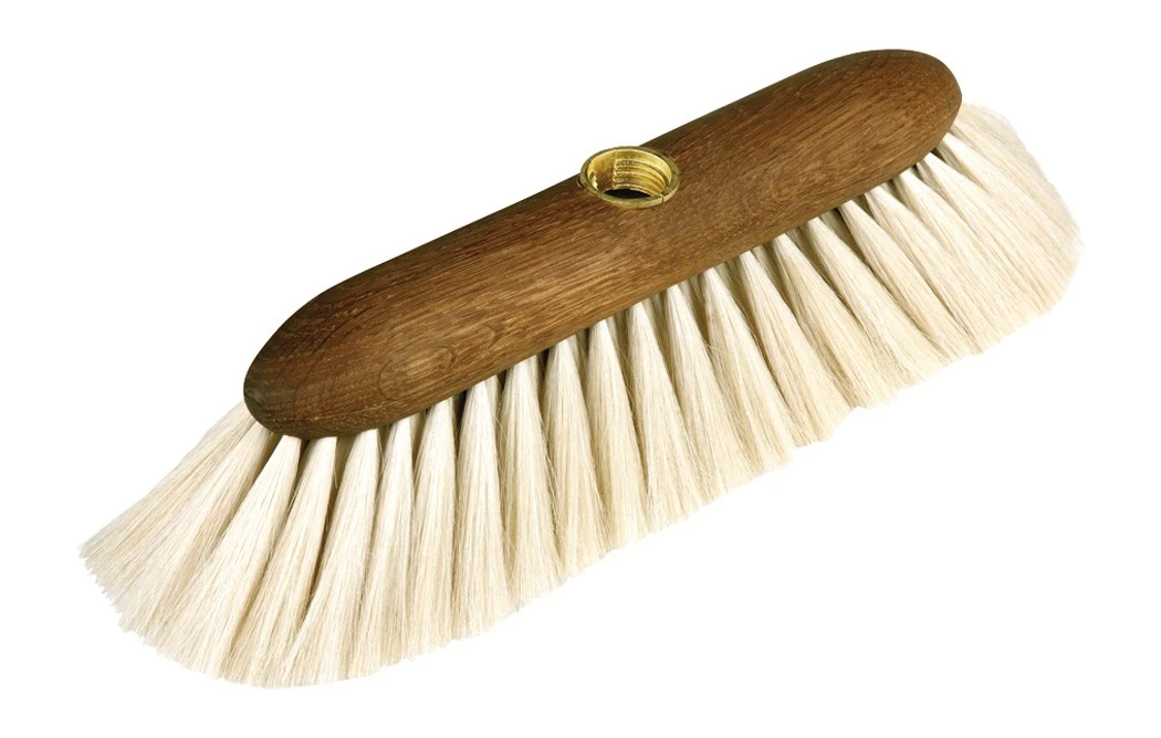Oiled oakwood broom head with goat hair bristle for threaded handle.