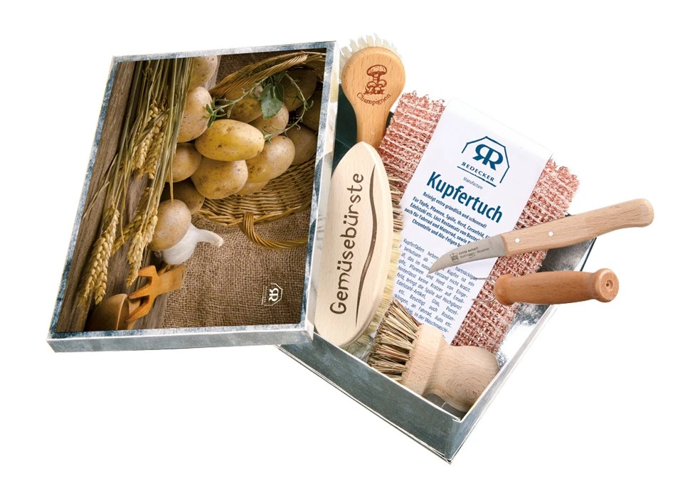 Vegetable kit in metal box with lid including: Copper scrubbing cloth, vegetable brush, pot scrubber, mushroom brush with handle & hot potato peeling set.