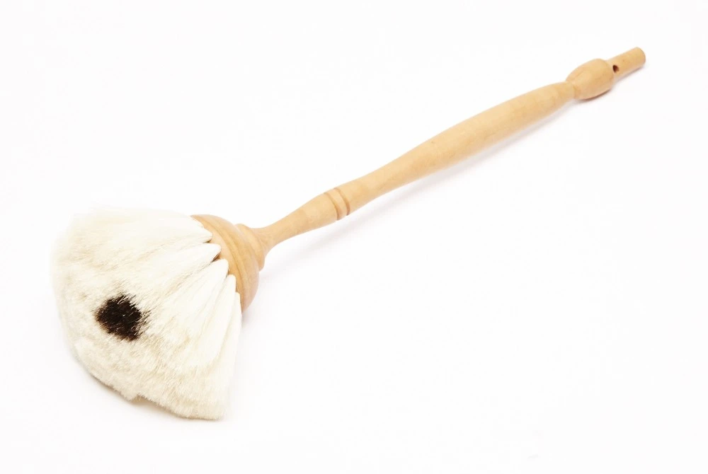 Wooden dust brush with oiled pearwood handle, & light goat hair with a black dot. Goat hair is so soft to touch – extremely tangible, thus one of the best dusters on the market!