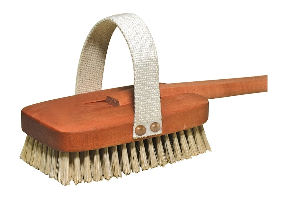 Wooden bath brush with oiled pearwood, removable cotton belt & light bristle.