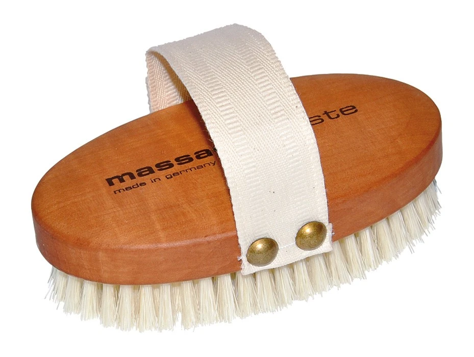 Wooden body massage brush with oiled pearwood, a cotton belt & stiff light bristle.