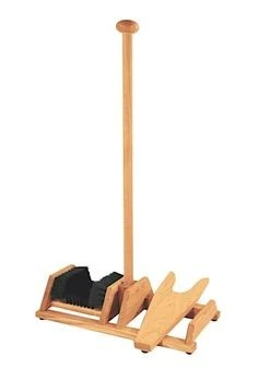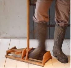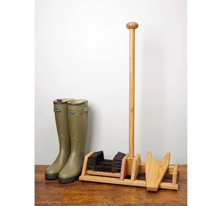 Wooden foot scraper with oiled oakwood handle, arenga fibre & boot jack. This smart foot scraper with boot jack cleans shoes, without having to bend over. Double-featured, one can first scrape the grit and dirt from shoes and boots, then use the jack to help remove them.