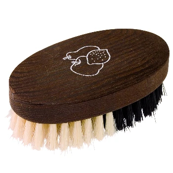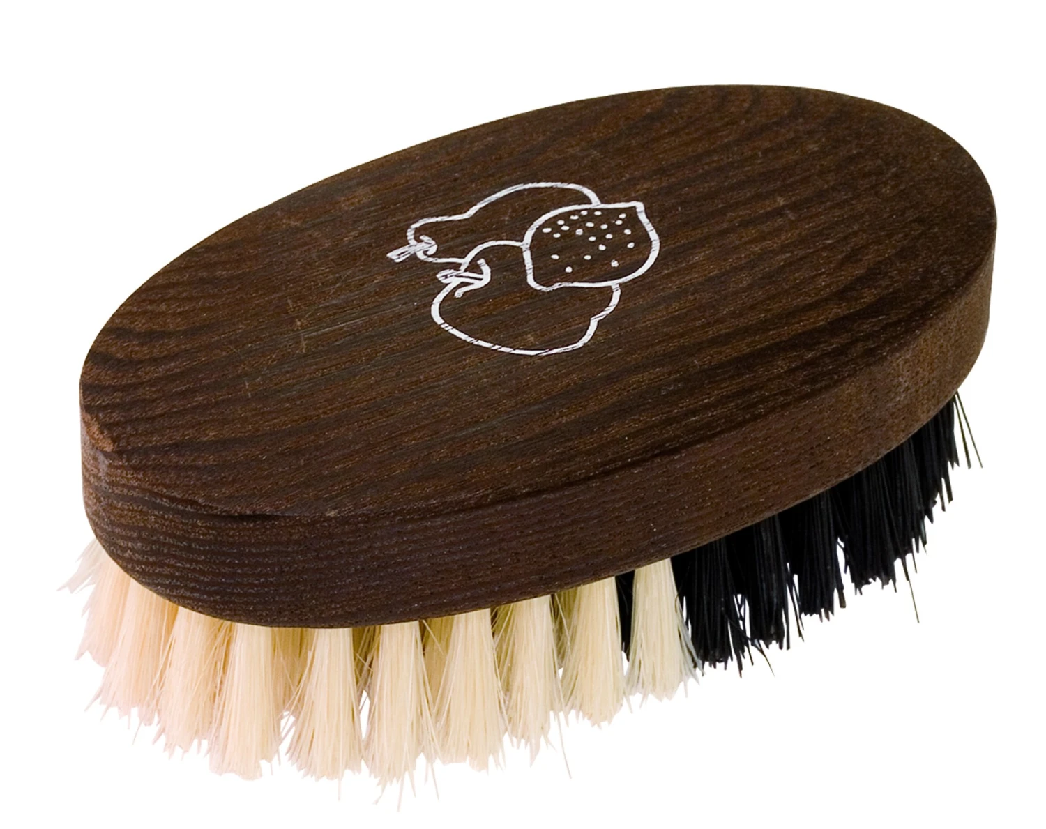 Wooden fruit brush with a stiff and soft side. Oiled thermowood with black & light bristles.