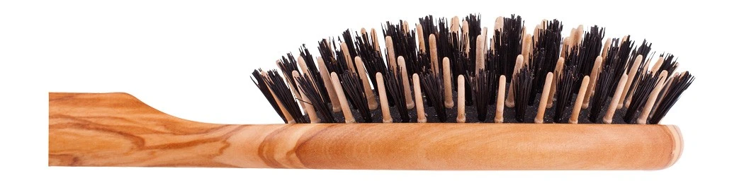Wooden hair brush with olive wood, maple pins & wild boar bristle. The surface of the special wood pins have a waxy friendly coating. The narrow wooden pins with rounded tips ensure gentle, pleasant scalp care for coarse or fine hair. Optimized bedding of the wooden pins in the rubber base also prevents hair loss during brushing.