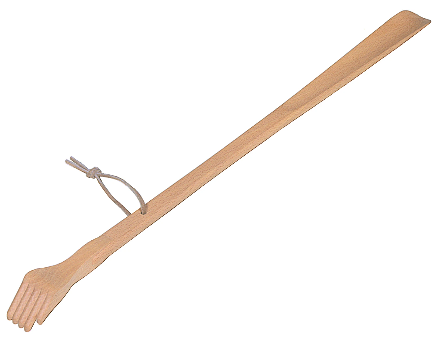 Wooden shoe horn with scratching hand & leather strap. Oiled beechwood.