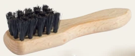 Wooden shoe polish applicator brush with untreated beechwood handle & black bristle.