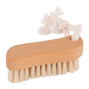 Wooden s-shaped travel nail brush with oiled beechwood & light bristle.